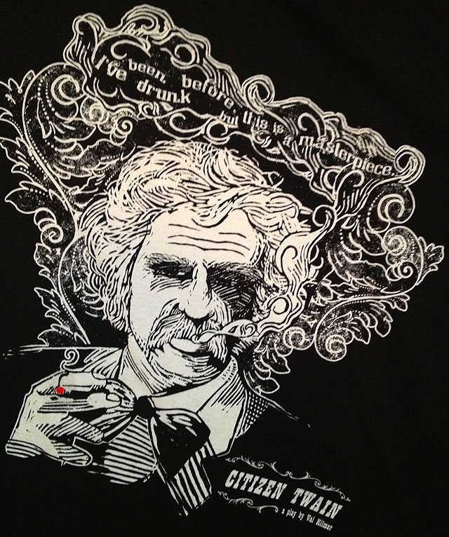 What does one do when one hears that Val Kilmer is in town? Well, volunteer to work the merch stand for a chance meeting with the Iceman. Tonight was a gorgeous night at Fulton, which made the long evening bearable as Val worked his magic on stage as Mark Twain. A few tidbits: People loved him as Doc Holliday in Tombstone. That signed photo sold out in minutes. I met his dramatic make-up artist who was having a breakdown over a broken bottle. He must have gone through ten hot towels whilst taking off Val’s makeup during the Q&A after the show. Val has been working on a documentary and movie about Mark Twain for eight years … that should be interesting. He’s a far cry from his Jim Morrison, Iceman and Batman days, but still quite an enigma.